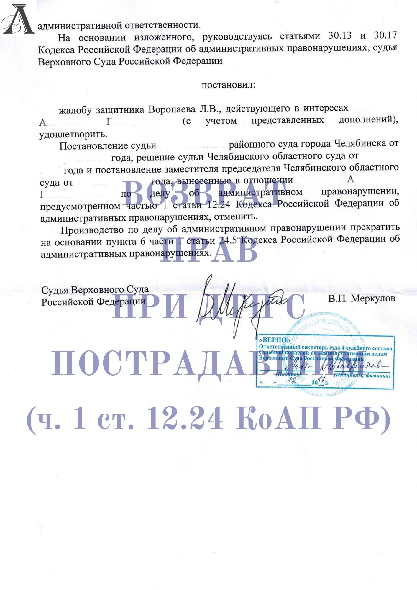 После чего он обратился к нам. Изучив дело, была подготовлена жалоба в Верховный Суд РФ, который в полной мере согласился с доводами жалобы и отменил все три решения нижестоящих судов. А водителю были возвращены права.