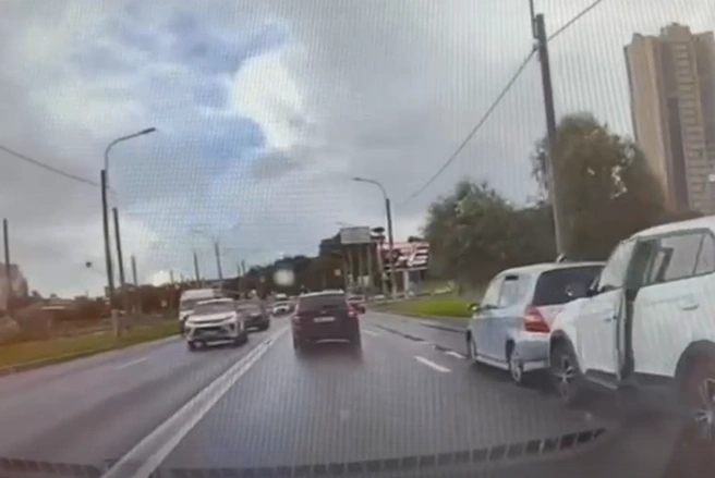 4-полосное шоссе с прямой видимостью, произошло небольшое столкновение — мы видим два автомобиля и выставленный аварийный знак. Машины стоят в правой полосе, а запись идет с регистратора в автомобиле, который едет по левой полосе. Вот открывается дверь в белом кроссовере, и в ту же секунду между автомобилями проскакивает мотоциклист — он теряет управление и падает. Смотрите видео.